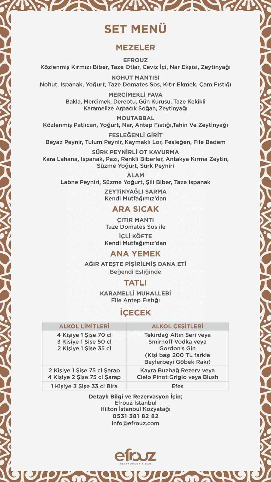 Efrouz, arkadaşınızla, nişanlınızla, eşinizle, ailenizle “bu akşam nereye gidelim, ne yapalım” düşüncesine, fikir alışverişine girmeden ortak noktada buluştuğunuz bir mekandır. Canlı müzik, dans şovları ve ritim darbukanın doğu esintileri eşliğinde eşsiz bir deneyim yaşayabilirsiniz.